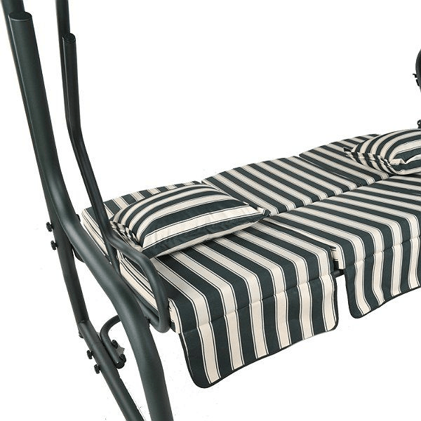 Foot and top carriers traverse Ø51×1,5mm, arms and vacuumed Ø32×1,5mm connection profiles. pipes and profiles of products, green electrostatically powder coated special texture. The product is vacuumed width 55x162cm, 130x190cm dimension of tarpaulin width. Vacuumed part of a special wire cage and latched. When opened can bed in 120x162cm size. Cushions are waterproof, water repellent polyester oxford fabric is made of striped pattern in which special carded waist. Cushions and fringed specially designed 3-piece self every part of the zipper reserved. Lace was made to slip. Inside the sheath 23 is 8 cm thick rigid foam filled DNC has lined cushions are. Awning part of the boiler is made of fabric with the same characteristics in a solid color.